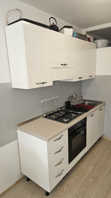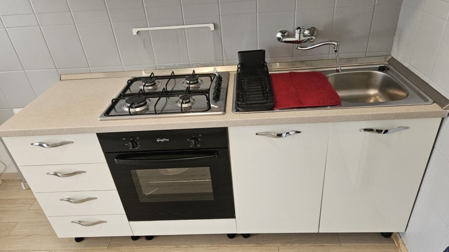 Na prodaju manja očuvana kuhinja. U cijenu uključena pećnica, plinska ploča za kuhanje i napa.