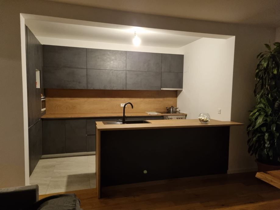 Kuhinja izrađena po mijeri kutna sa otokom u kojem je sudoper i perilica