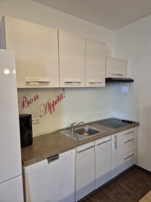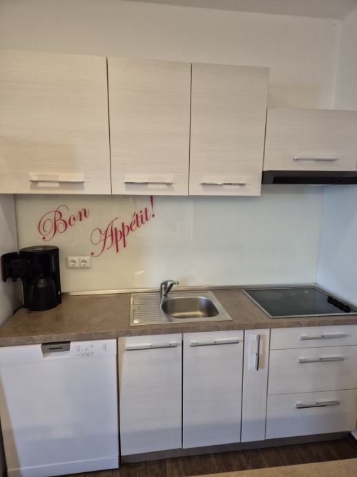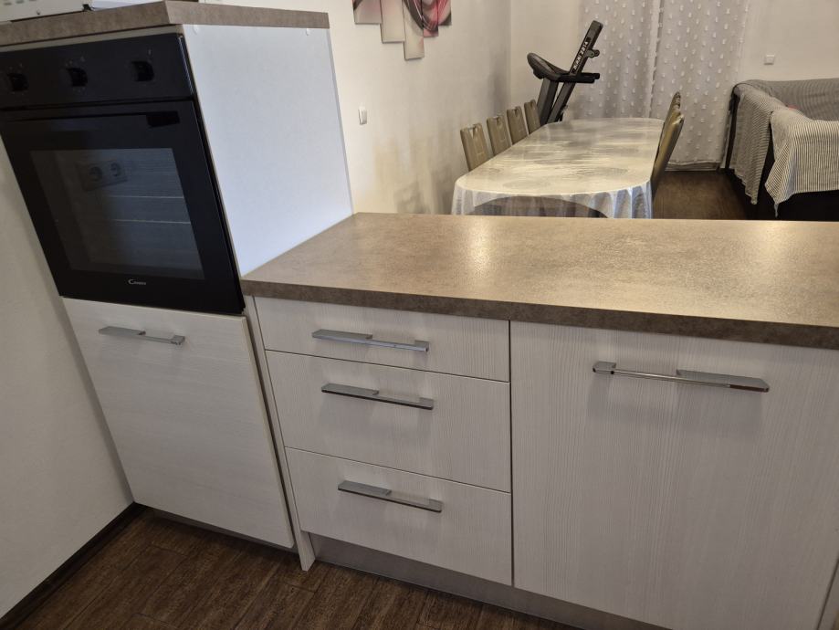 Kuhinja se sastoji od slijedećih elemenata: ladičar šir 60, uski klizni element šir 15, element za sudoper šir 70 cm. Na otoku su visoki element za rernu šir 60 (vis 146), ladičar šir 61,5 i element s policom šir 61,5. Ima i još 1 element s policom šir 33,5. Može se sve drugačije sklopiti uz kupnju nove radne ploče. Viseći elementi: 1 kom šir 60 i visine 71; 2 kom šir 44,5 i visine 71; 1 kom šir 60 i visine 35,5 (iznad nape). Uz kuhinju idu rerna, napa, staklokeramička ploča za kuhanje i sudoper, te mašina za pranje suđa. Kuhinja je talijanske proizvodnje s usporivačima na ladicama i vratima. Zvati nakon 17 h.