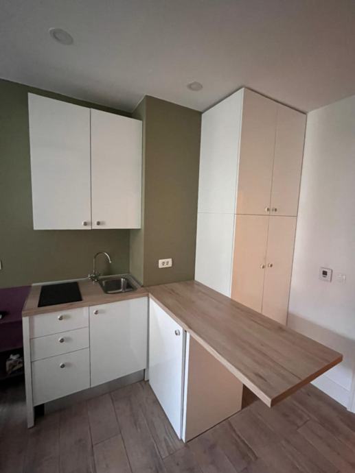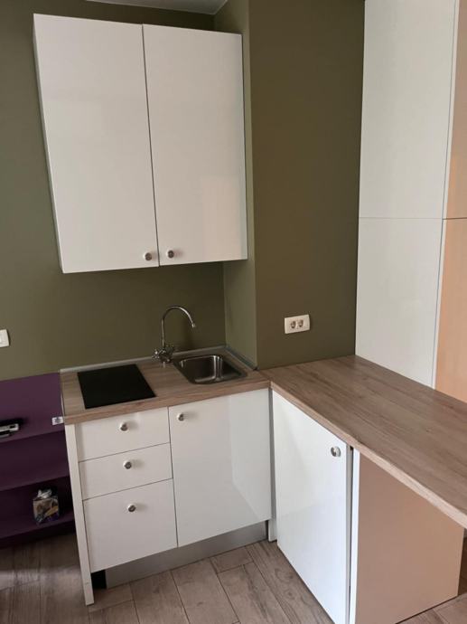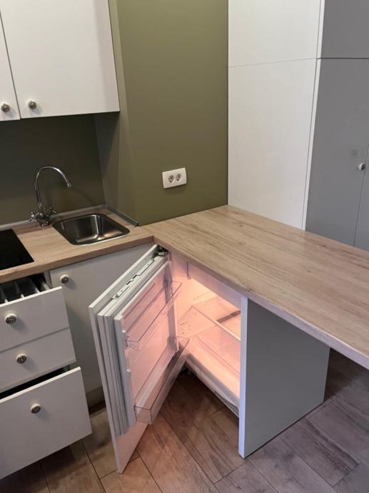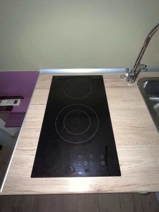 Integrirana staklokeramička ploča, sudoper i mali frižider s ledenicom.