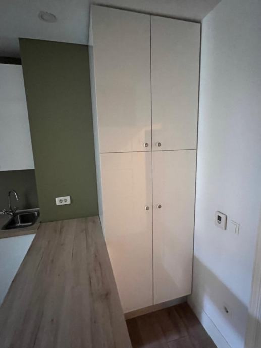 Dužina dijela sa staklokeramičkom pločom i sudoperom 93 cm, dužina radne ploče 145,5 cm, dužina dijela ispod radne ploče (ugrađeni frižider) 63,3 cm, visina donjih elemenata 92 cm, dužina velikog ormara pored radne ploče 86 cm, visina velikog ormara 264 cm.