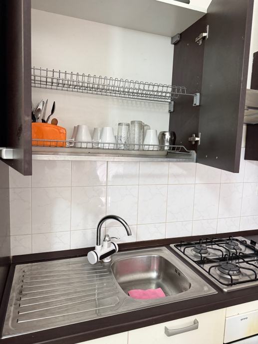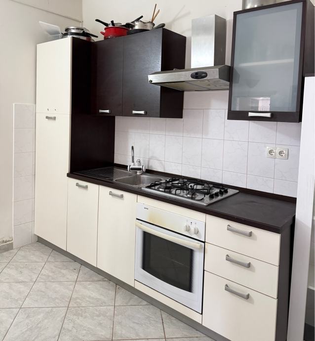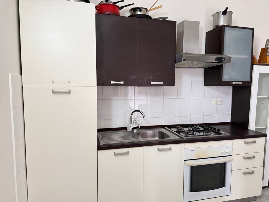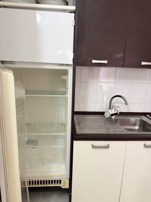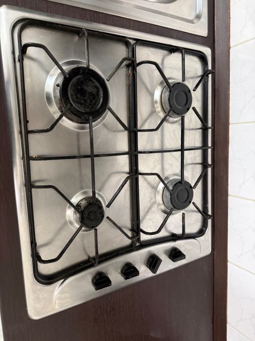 Kuhinja sa komplet aparatima, napa, sudoper, pećnica, frižider, plinski štednjak.