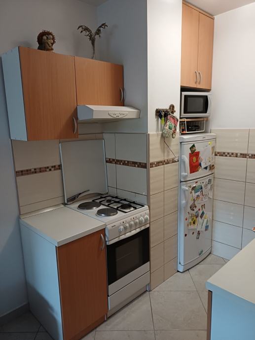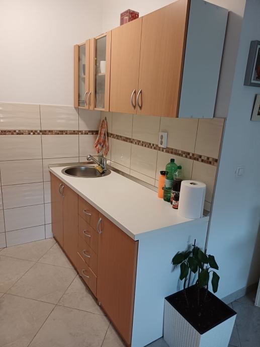 Prodajem kompletnu kuhinjsku garnituru koja uključuje gornje i donje elemente. Donji elementi su u kombinaciji bijele i bukve, s ladicama i vratima opremljenim metalnim ručkama. Gornji elementi su iste kombinacije materijala, s ostakljenim dijelovima na nekim vratima. Radna ploča je bijele boje. Kuhinja dolazi s ugrađenim sudoperom.