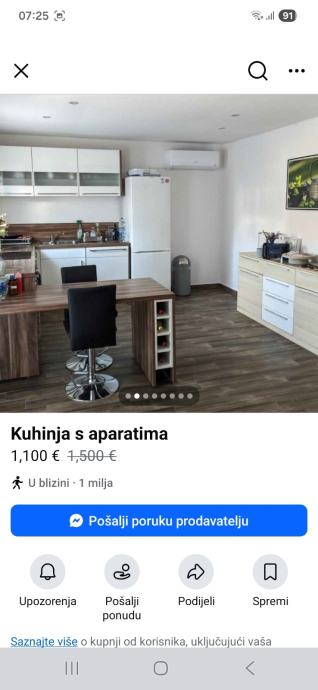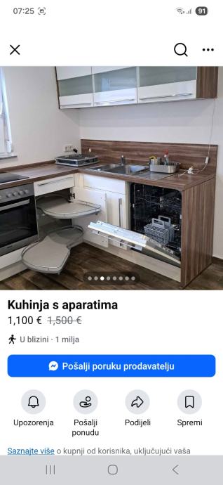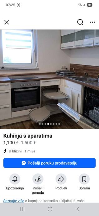 Prodajem kompletnu kuhinju s aparatima. Kuhinja je bijele boje s radnom pločom u dekoru drva, a uključuje gornje i donje ormare. Od aparata dolaze ugrađena pećnica, perilica posuđa i hladnjak. Kuhinja ima kutni element s rotirajućim policama koje olakšavaju pristup. Sudoper je ugrađen u radnu ploču. Kuhinja dolazi zajedno s blagovaonskim pultom na visoke noge s dvije barske stolice.