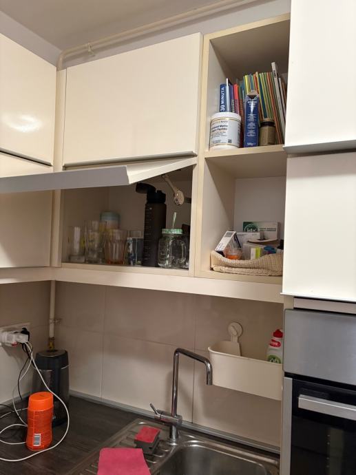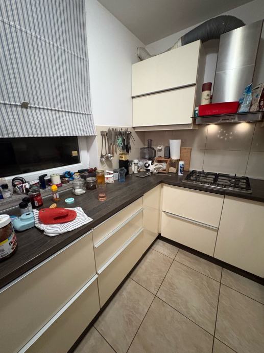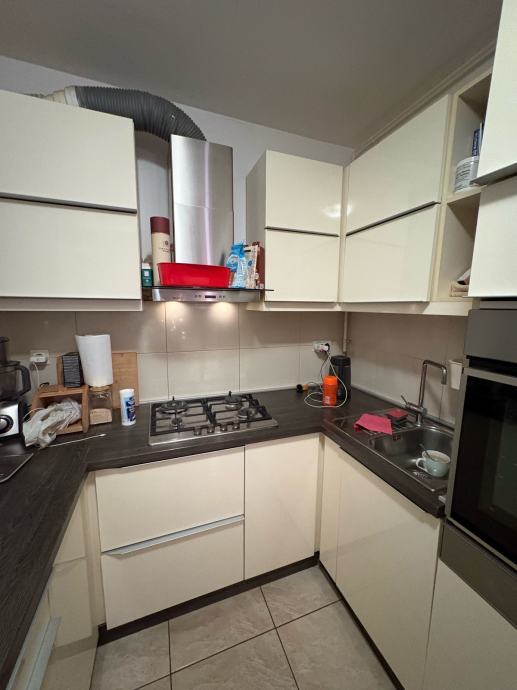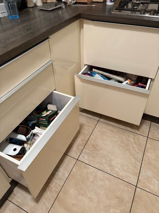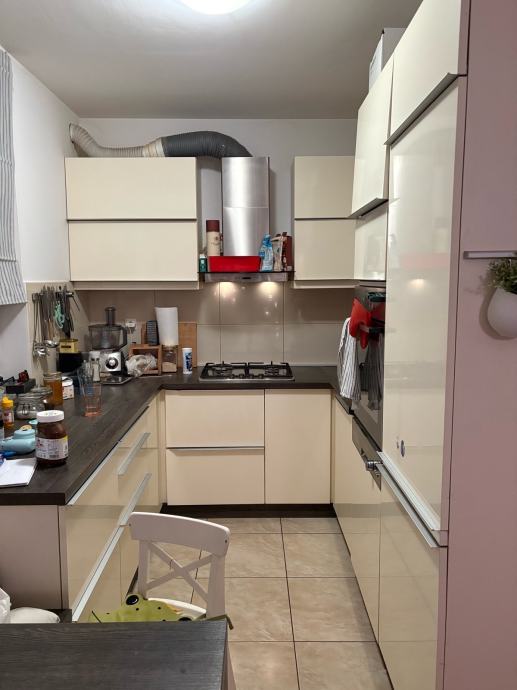 Prodajem kompletnu kuhinjski blok u U obliku, krem boje s visokim sjajem i tamnom radnom pločom. Kuhinja je raspoređena na način koji omogućuje dobro iskorištavanje prostora, s gornjim i donjim elementima te visokim stupcima.