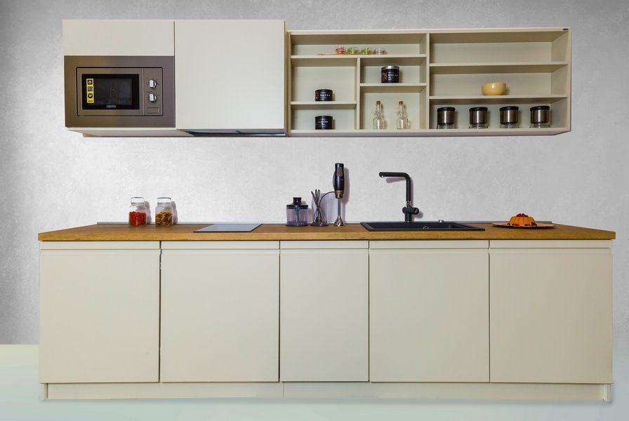 Kuhinja prezentirana kao sajamski eksponat, izrađena od vodootpornog materijala medijapan folija sa ureznom ručkicom. Neutralne bež boje, kuhinja se uklapa u svaki ambijent. Svojom jednostavnošću i kompaktnim dizajnom pruža maksimalnu funkcionalnost.