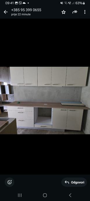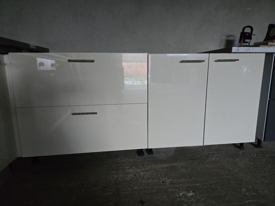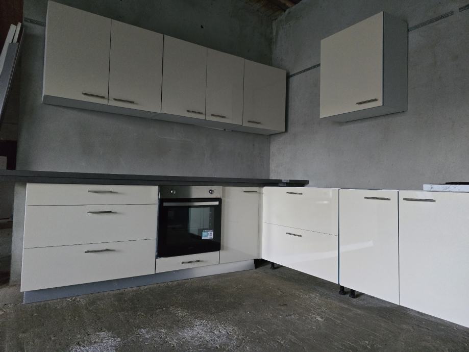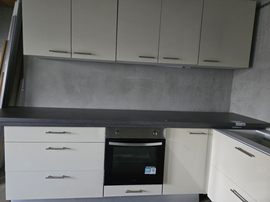 Kuhinja je nova. Moze se uzeti i samo dio kuhinje. Cijena je 550 E po metru ( gornji i donji elementi zajedno. Kuhinja ima plasticne nogice ( moze i sa lasnom/"coklom") i mekano zatvaranje vrata i ladica.
