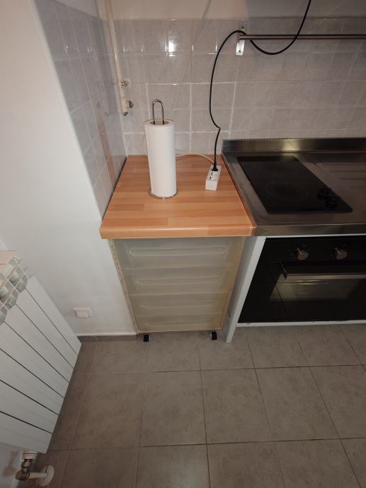 Također, dolje se uz blok nalazi neovisan ladičar IKEA, dimenzija 50 cm (š) x 90 cm (v), a gore mali kredenc na kip.