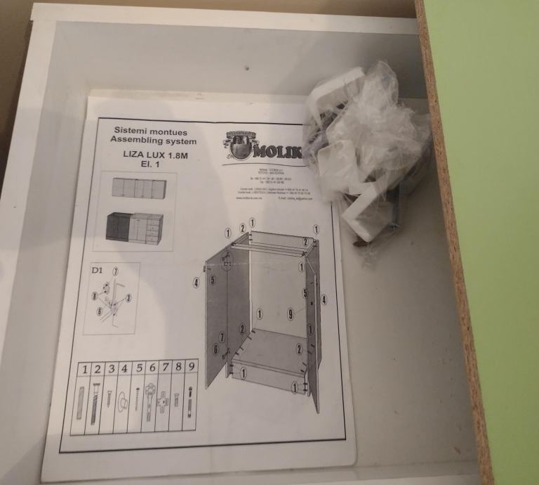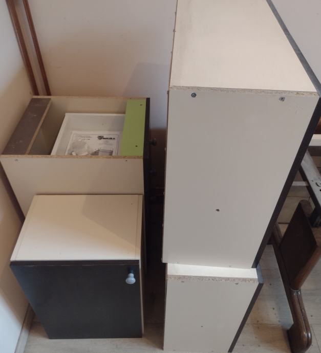 Kuhinjski elementi su rastavljeni na manje dijelove i skinuti sa zida (kao što je prikazano na fotografijama) te su spremni za nošenje i prijevoz.
