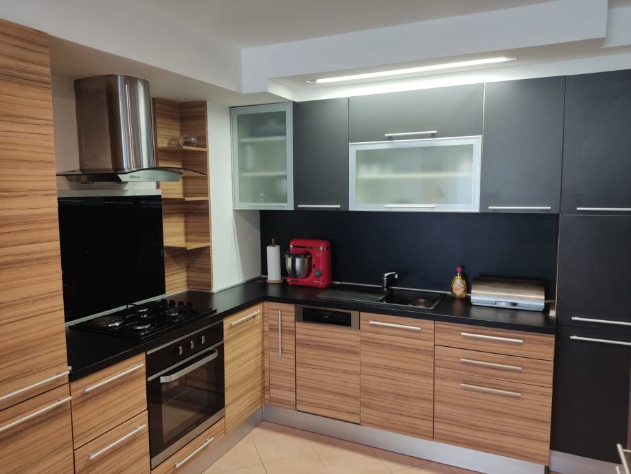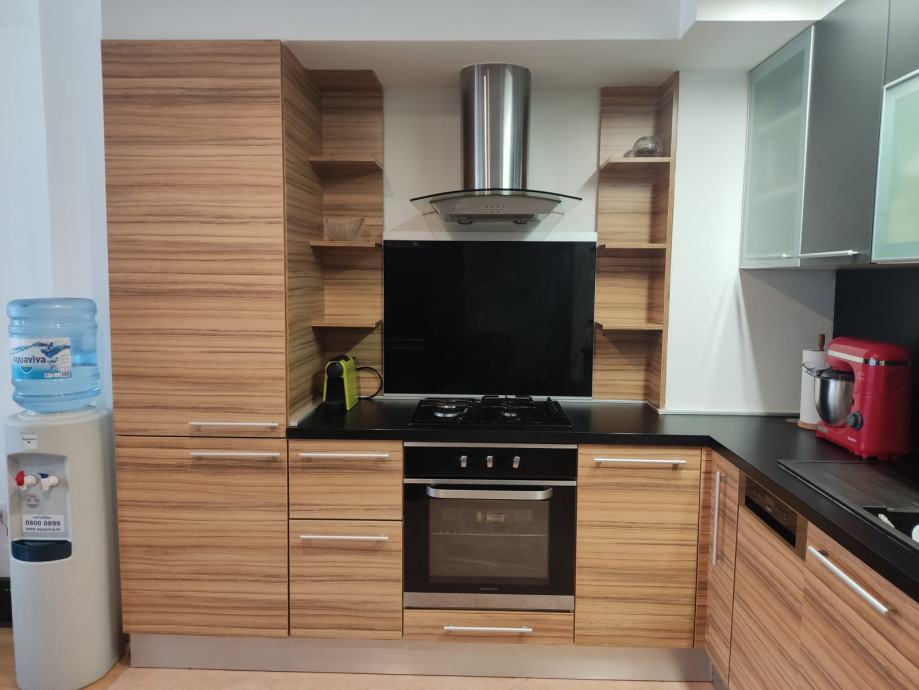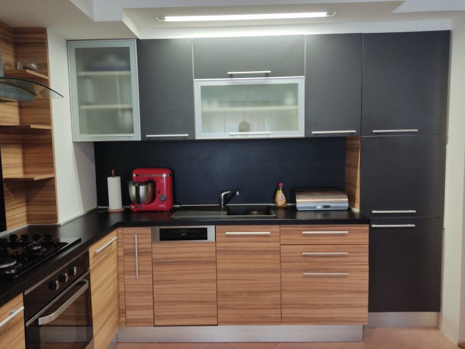 Kuhinja se prodaje sa svim ugradbenim elementima: perilica posuđa Whirlpool, kombinirani hladnjak Blomberg, štednjak i plinska ploča (3+1) Končar, napa Excello, sudoper (crni granit) i slavina.