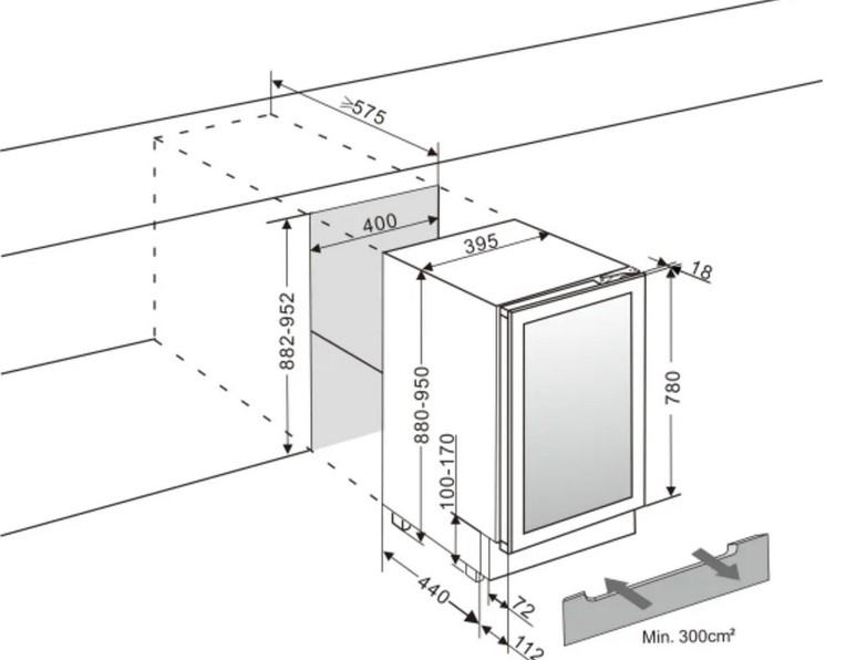 Hladnjak za vino dizajniran je za jednostavnu ugradnju ispod kuhinjskog pulta, a vrata boje drveta pristaju u ravnini s vratima kuhinjskog elementa za elegantan i neprimjetno integriran izgled.