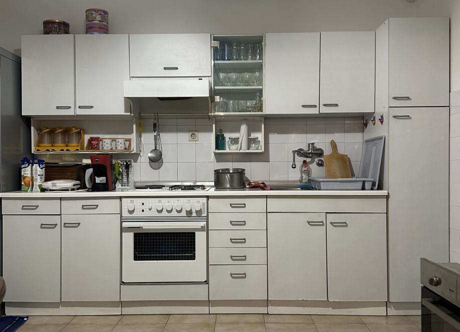 Poklanjam kompletnu kuhinju sa stolarijom sa slike i ugradbenim uredjajima: stednjak na plin i pečnica. Frizider nije uključen. Kuhinja je stara ali i dalje funkcionalna. Dužina 3 metre.