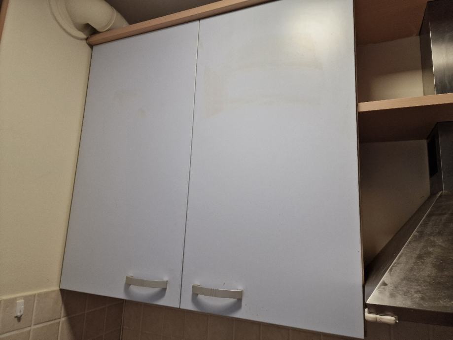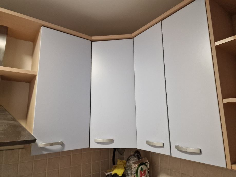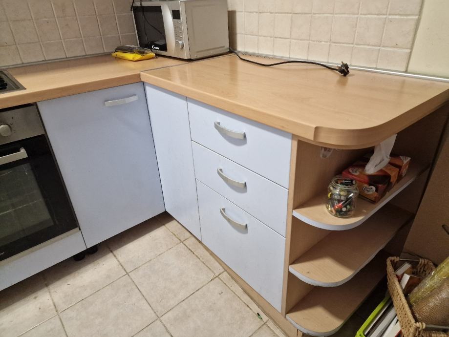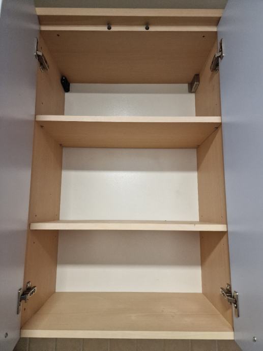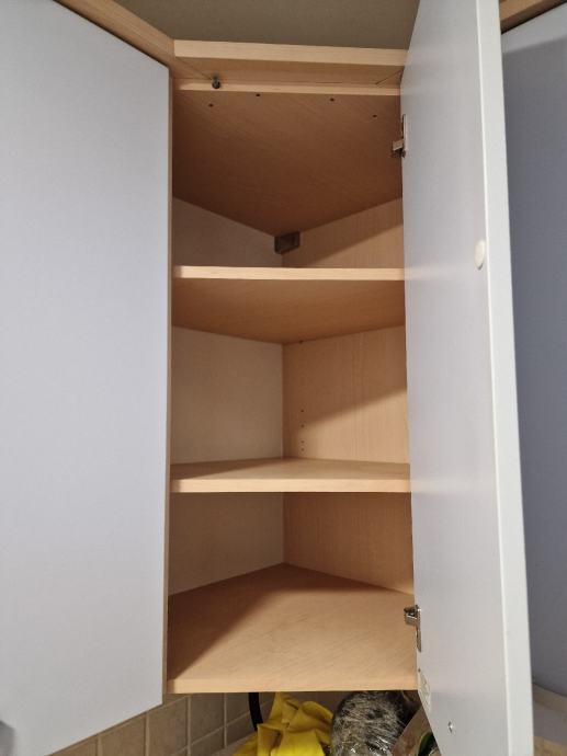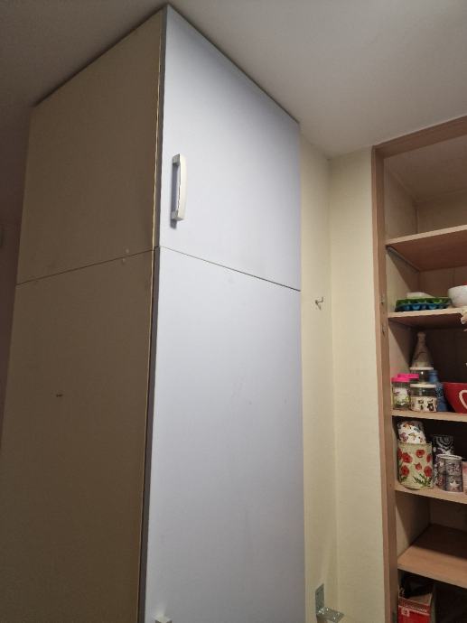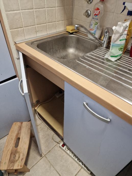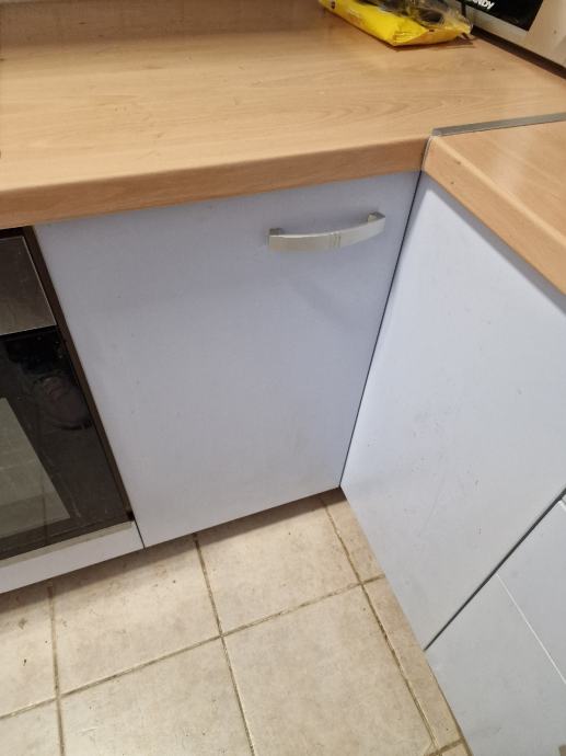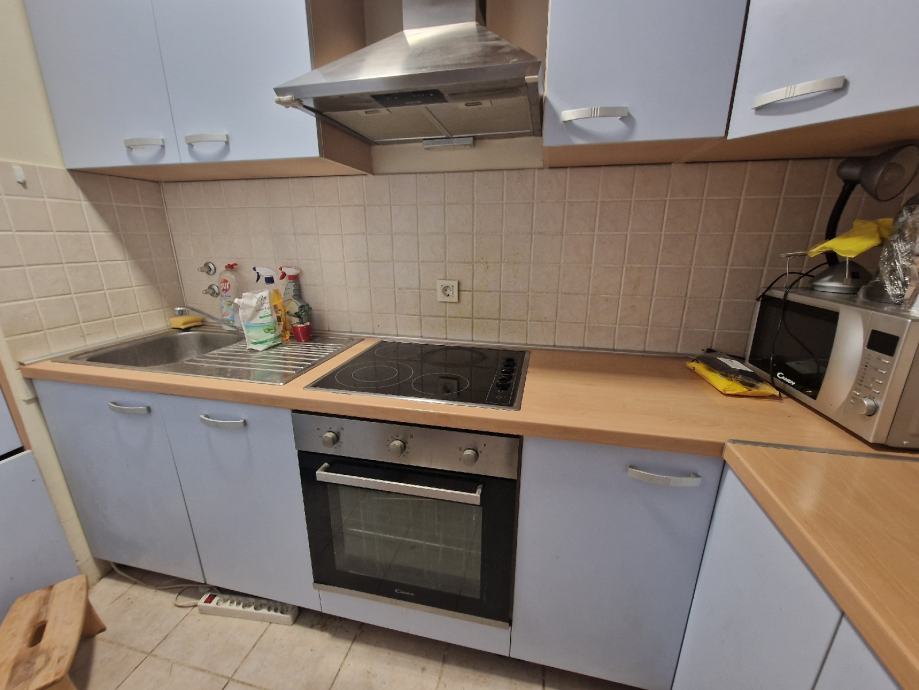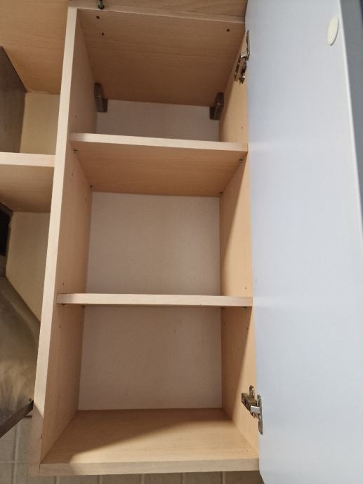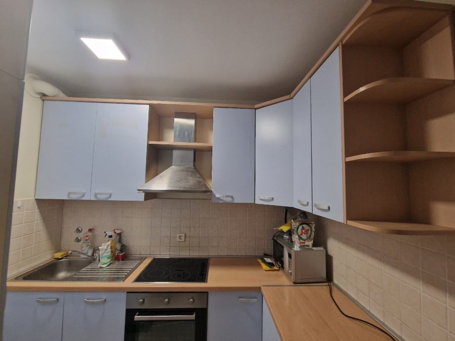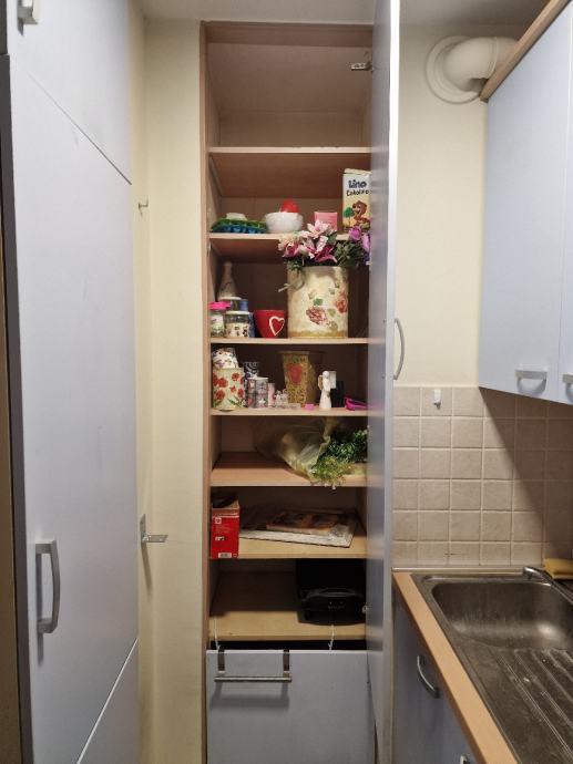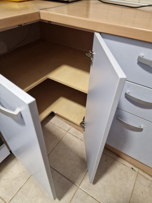 Kuhinja je kvadratastog oblika, s druge strane ima i ormarice za ulazni dio.
