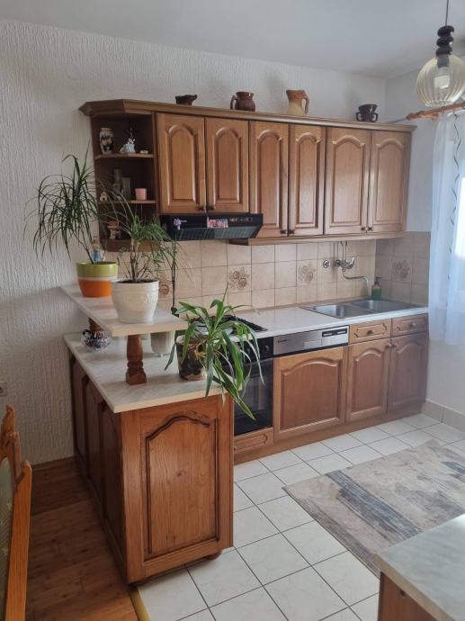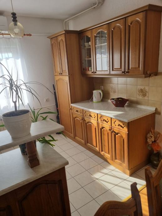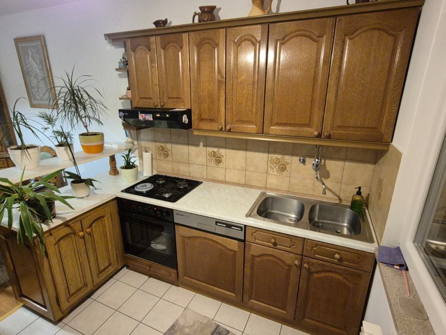 Prodajem drvenu kuhinju, iznimno očuvanu. Dužina lijevog i desnog bloka kuhinje su 2 m plus šank dimenzija 1,33 m x 0,55 m. Cijena = 1.800 eur