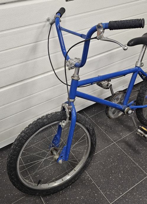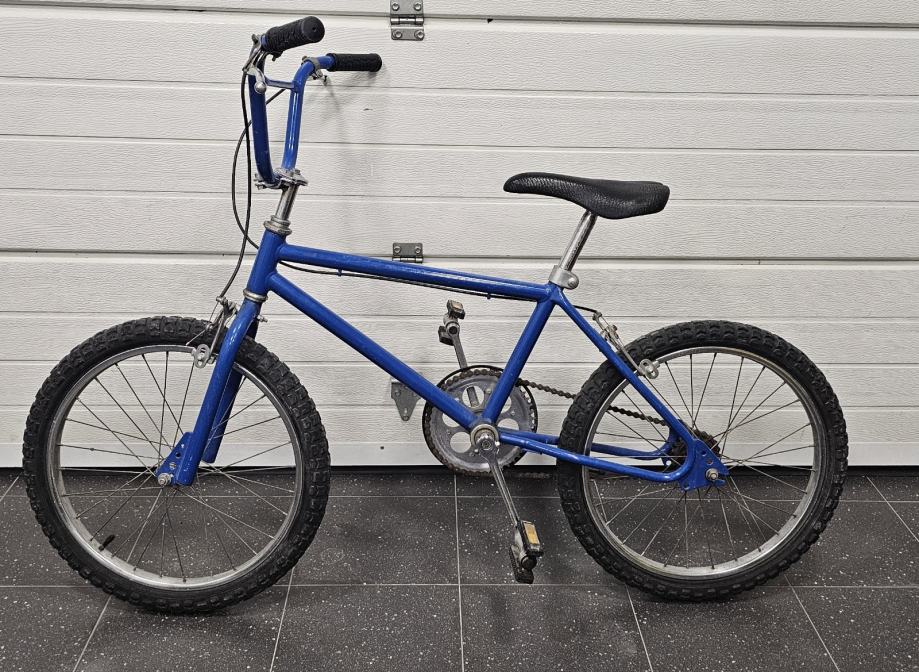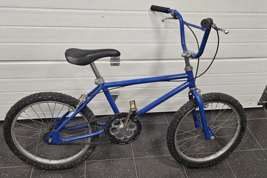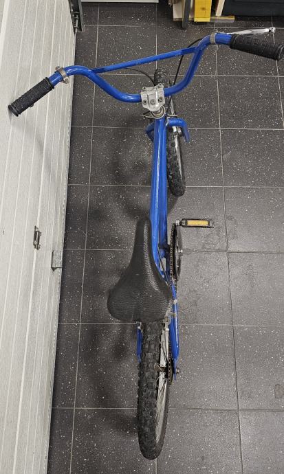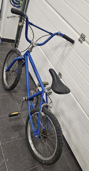 Prodajem BMX bicikl u plavoj boji. Bicikl ima klasičan BMX okvir s visokim upravljačem i karakterističnim crnim gumiranim ručkama. Oprema uključuje crno sjedalo i pedale. Kotači su standardne BMX veličine s profiliranim gumama pogodnim za vožnju. Bicikl je funkcionalan i spreman za upotrebu.
