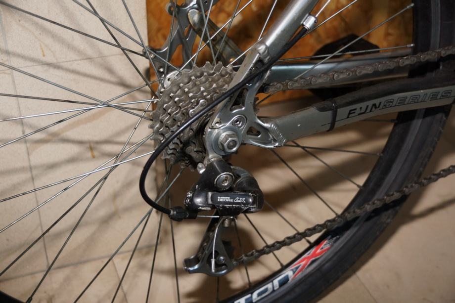 Aluminijski okvir - štel. Kotači 26 x 1.75 cola, s duplim stjenkama na obruču. Shimano Deore LX mjenjači brzina s 21 brzinom. Ručna prednja i zadnja kočnica Shimano. Bicikl je u dobrom stanju, od stajanja prednji amortizer treba razraditi da radi. Bicikl i stanje bicikla vidljivo na priloženim fotografijama. Po telefonskom dogovoru bicikl se može doći svakodnevno pogledati i isprobati u vožnji tijekom cijelog dana. Ne šaljem običnom pošiljkom. Poželjno osobno preuzimanje zbog visokih troškova poštarine. U slučaju nemogućnosti osobnog preuzimanja po vidljivoj uplati pošiljku šaljem Hrvatskom poštom po njihovom cjeniku isti ili slijedeći radni dan. U gubitka pošiljke vraćam kompletno uplaćeni novac. Za ostale informacije možete me kontaktirati na mobilni telefon broj: 091 513 92 63. Na SMS poruke ne odgovaram.