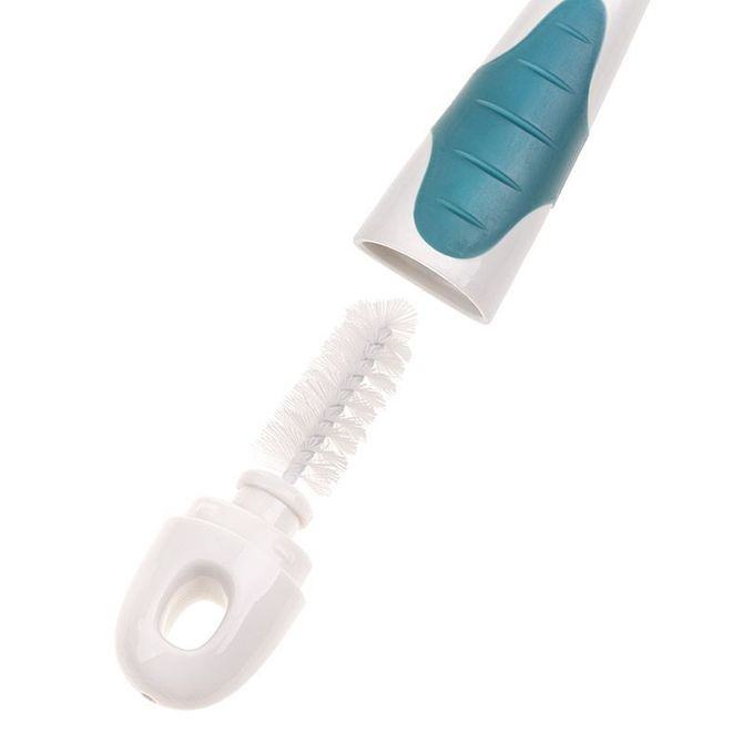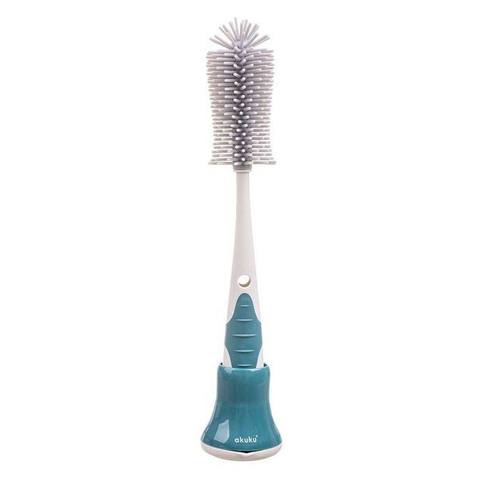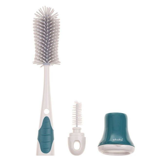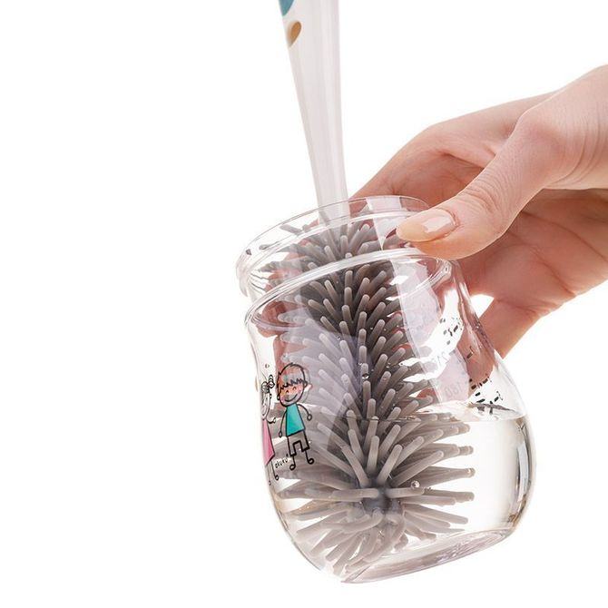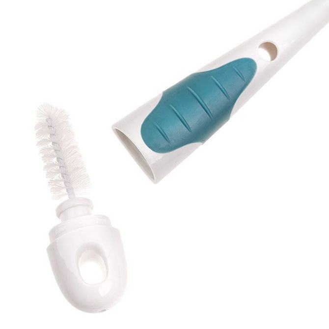 Čišćenje dječjih bočica, čašica i cucli ne mora se činiti kao potpuni posao s ovom sjajnom silikonskom četkom 2 u 1 sa postoljem. Izdržljiva čekinja izrađena je od mekanog silikona za čišćenje otporno na ogrebotine. Manja, odvojiva četkica za čišćenje sisa pohranjena je unutar ručke, održavajući je čistom i bez prljavštine kada se ne koristi. Higijenski, uspravni stalak za odlaganje ima posudu za ocjeđivanje tako da će nakon upotrebe sav višak vode otjecati u posudu spremnu za izlijevanje. Dugačka ergonomska ručka odlična je za čišćenje teško dostupnih mjesta. Izrađen od izdržljivih i sigurnih materijala koji ne sadrže Bisfenol A (0% BPA).