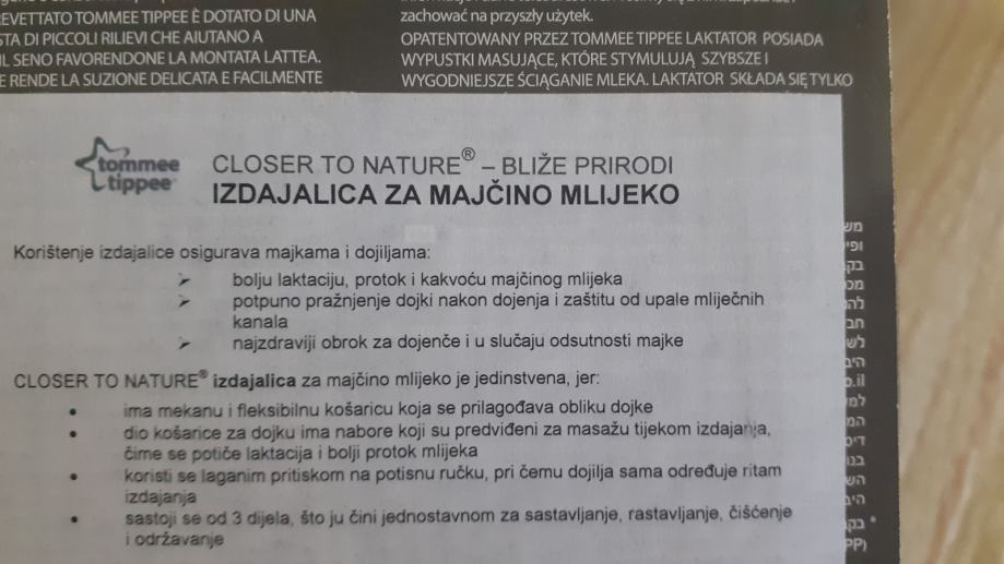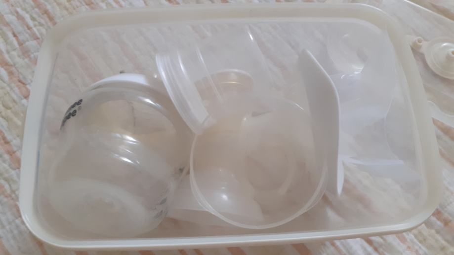 Sadrži izdajalicu, nastavak za bočicu, bočicu, posudicu za čuvanje mlijeka 50ml s poklopcem, plastični spremnik s poklopcem koji može služiti kao posuda za steriliziranje u mikrovalnoj.