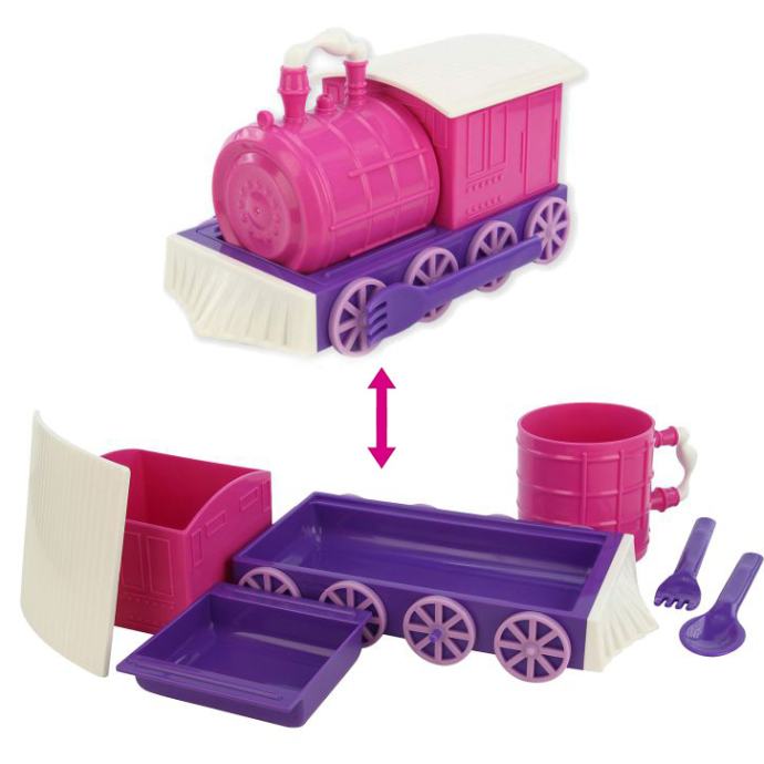 Za ovaj problem preporučujemo ovaj vrlo sladak i zabavan set u obliku lokomotive izvorno nazvan "Food Train". Igračka podsjeća na pravu lokomotivu u kojoj se skriva kuhinjski pribor: šalica s ručkama za čaj ili sirup, ravni tanjur s ukrasnim kotačićima, duboki tanjur za juhu, vilica i žlica, te mali tanjur za manja jela, npr za ukusno i zdravo povrće.
