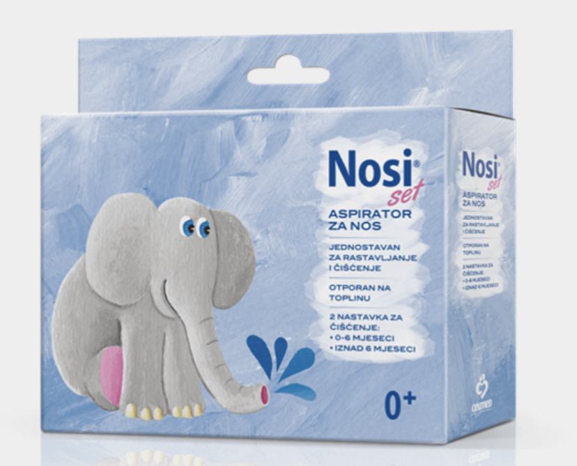 Nosi set aspirator za nos je medicinski proizvod koji radi na svaki kućni usisavač. Djelotvorno i na siguran način uklanja sekret iz nosa dojenčadi i djece koja ne znaju samostalno ispuhati nos.