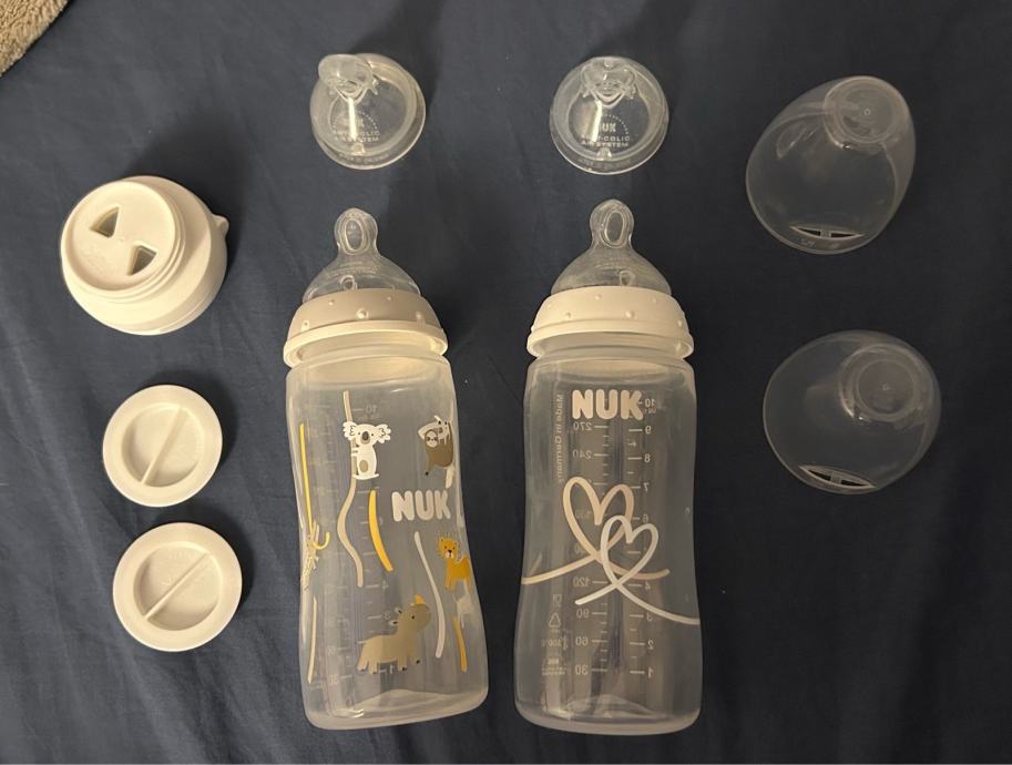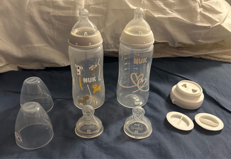 NUK First Choice (2x 300 ml) dječje bočice. U kompletu dolaze i dva NUK First Choice sisača veličine 1 i nepropusni poklopac na zatvaranje.