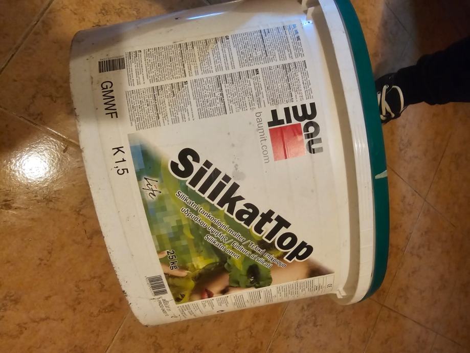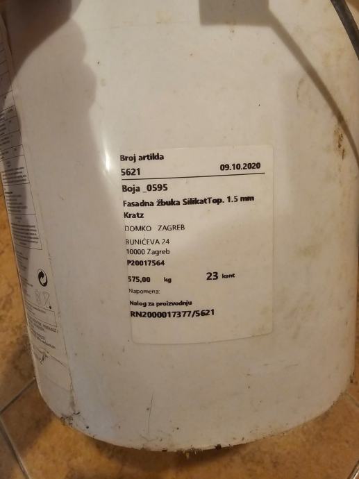 Boja za fasadu,granulat.Fasadna žbuka silikat 1.5mm.Imam 575kg,23 kante.Kante se hermetički zatovorene.Specifikacije i tip,broj boje pišu na kanti.Cijena je 30e po kanti.