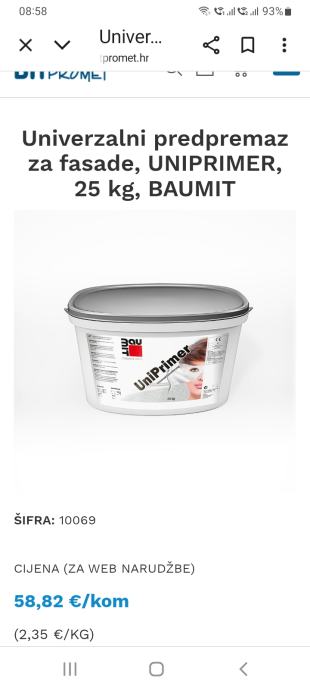 Univerzalni predpremaz, spreman za upotrebu, za ujednačavanje upojnosti podloge i poboljšanje prionljivosti. Koristi se u svim Baumit povezanim sustavima za toplinsku izolaciju (izuzev Baumit open - Klima fasada), kao i na svim podložnim žbukama. Cijena po kanti 40 eura, dok u trgovini košta 58,82 eura.