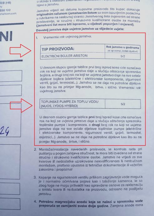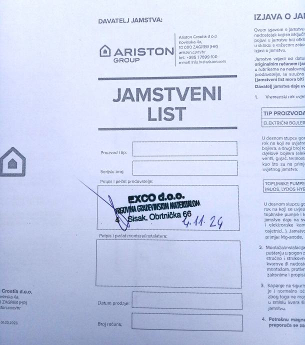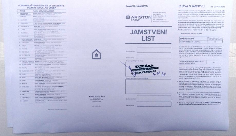 - ovjeren / potpisan jamstveni list, jamstveni rok počinje od 4.11.2024. i za određene dijelove bojlera traje pet (5) godina, dok za ostale dijelove bojlera traje dvije (2) godine, vidi: detalje jamstva u priloženim fotografijama