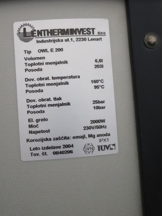 Prodajem polovni bojler LenthermInvest OWL-E 200, zapremine 203 l.