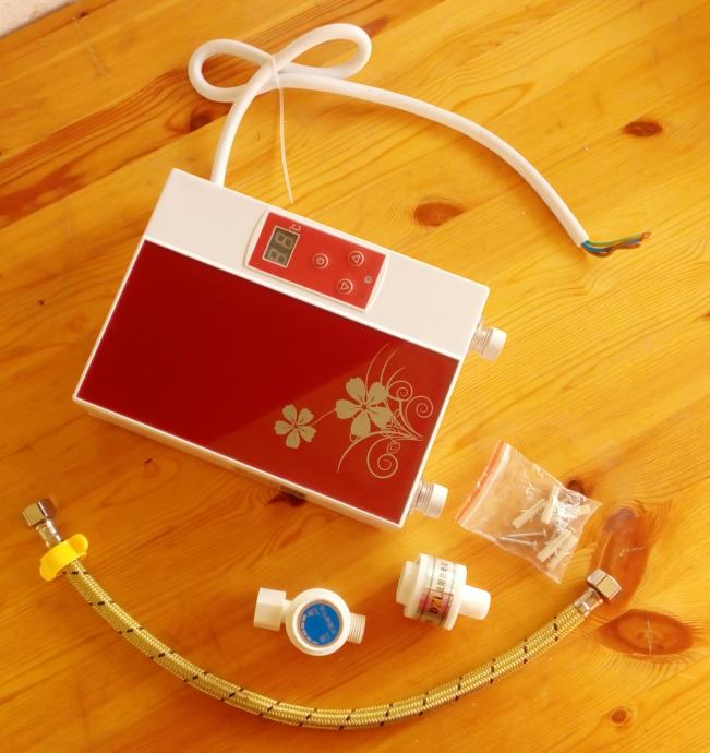 Prodaje se novi dekorativni mali protočni bojler Pogodan za apartmane. Temperatura zagrijavanja 35-55C. Zaštita od pregrijavanja (65C). 3 programa. Prikaz temperature vode na display-u. Korišten samo jednom (provjera ispravnosti). Dimenzije 238 x 178 x 60 mm.