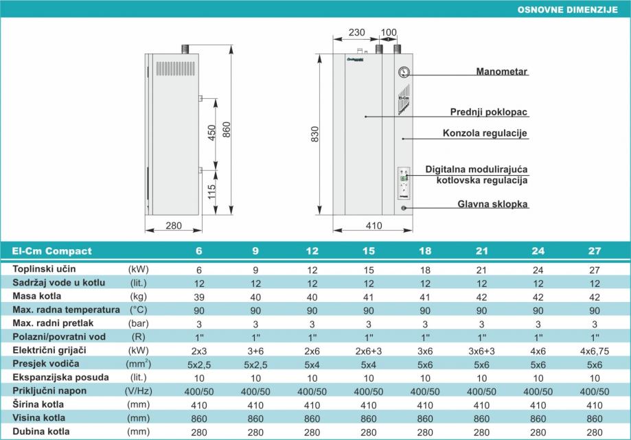 Čelični toplovodni elekro kotlovi El-Cm Compact, nazivnog toplinskog učina 6, 9, 12, 15, 18, 21, 24 i 27 kW predviđeni su za zagrijavanje manjih kuća ili stanova kao samostalni ili kao pomoćni izvor topline na električnu energiju. Danas se sve više koriste i za zagrijavanje potrošne tople vode u akumulacijskim bojlerima, spajanjem na cijevni izmjenjivač bojlera. Kotlovi su opremljeni cirkulacijskom pumpom, ekspanzijskom posudom, modernom modulirajućom digitalnom regulacijom te potrebnim sigurnosnim elementima. Bešuman rad i moderan dizajn čini ih prihvatljivim za ugradnju u bilo koji dio kuće ili stana, tim više što ne zahtijevaju ventilaciju ili dimnjak. Korištenje modernih tehnologija izrade, kvalitetnih materijala gradnje te provjerenih tehničkih rješenja koja uključuju i sve prednosti modulirajuće regulacije rada elektrogrijača, čine ove kotlove sigurnim i pouzdanim u radu. Proizvedeni su u skladu s normom ISO 9001:2008.