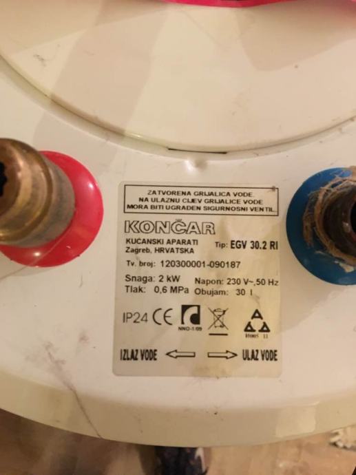 Električni bojler Končar EGV 30.2 RI u super stanju, malo korišten. Uz bojler dolazi i sigurnosni ventil.