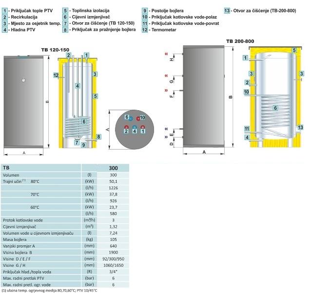 Toplovodni bojler TB volumena 300 litara namijenjen je zagrijavanju i akumulaciji potrošne tople vode spajanjem na krug kotla ili na neki drugi izvor topline unutar nekog tehnološkog procesa.