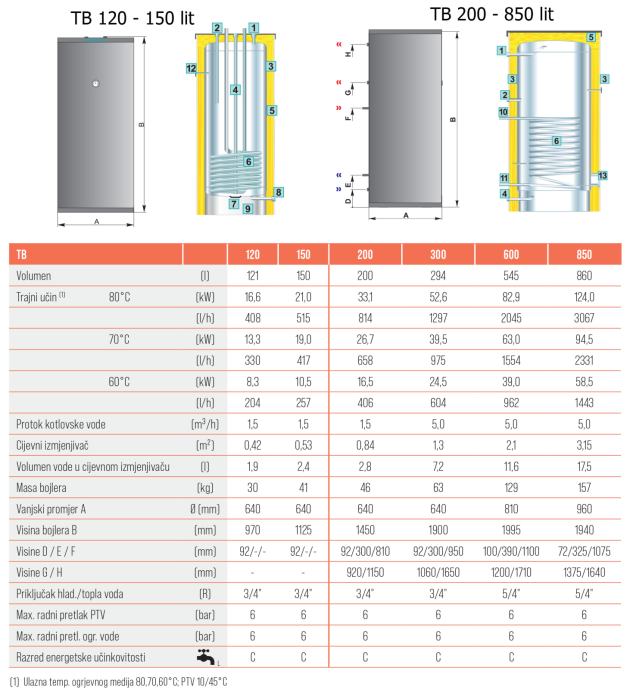 Toplovodni bojleri TB volumena 120 do 850 litara namijenjeni su zagrijavanju i akumuliranju potrošne tople vode spajanjem na krug kotla u kotlovnici ili na neki drugi izvor topline unutar nekog tehnološkog procesa. Često se ugrađuju uz solarne sisteme kao dodatna akumulacija uz solarne bojlere.