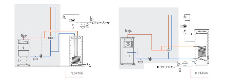 Kod bojlera TB 120 i 150 priključci su smješteni sa gornje strane bojlera dok su kod bojlera TB 200, 300, 600 i 850 priključci sa zadnje strane bojlera što omogućuje jednostavno i brzo spajanje na instalaciju.