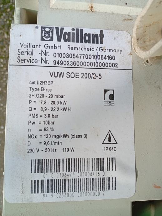 Vaillant plinski bojler za grijanje i pripremu tople vode WUV SOE 200/2-5, na dimnjak, servisiran, potpuno ispravan. Radio na grijanju 8169 h, na toploj vodi 1428.