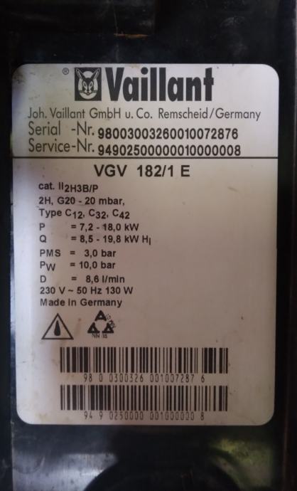 Vaillant plinski bojler VGV 182/1 E fasadni. Bojler se prodaje u kompletu za dijelove