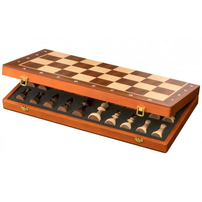 Šahovska ploča od drveta topole, umetci od javora u boji mahagonija, ukrasna linija, brojevi i slova. Dimenzije sklopljenog 475 x 235 x 56 mm. Veličina polja 50 mm.