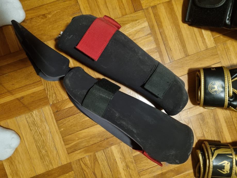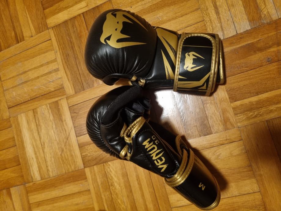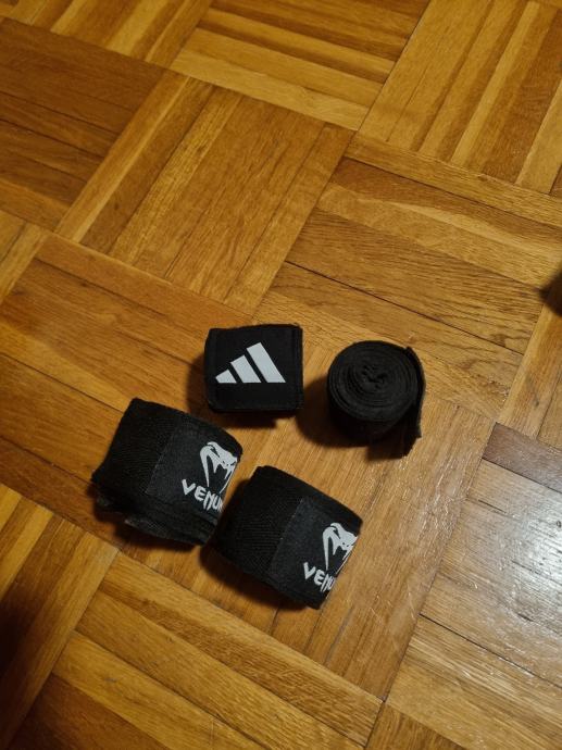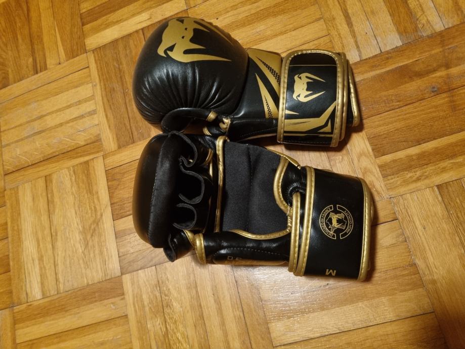 Sva oprema: velike adidas boks rukavice 14oz, male venum MMA rukavice za trening, kickovi L velicina (stitnici za noge), suspenzor (jajobran) M velicina, dva para bandazi (venum- dugacke, adidas- kratke)