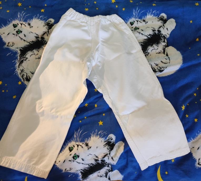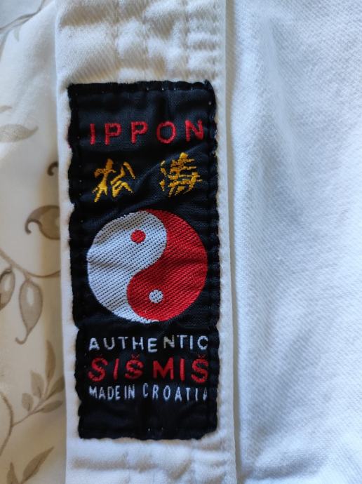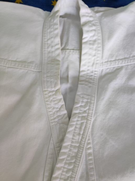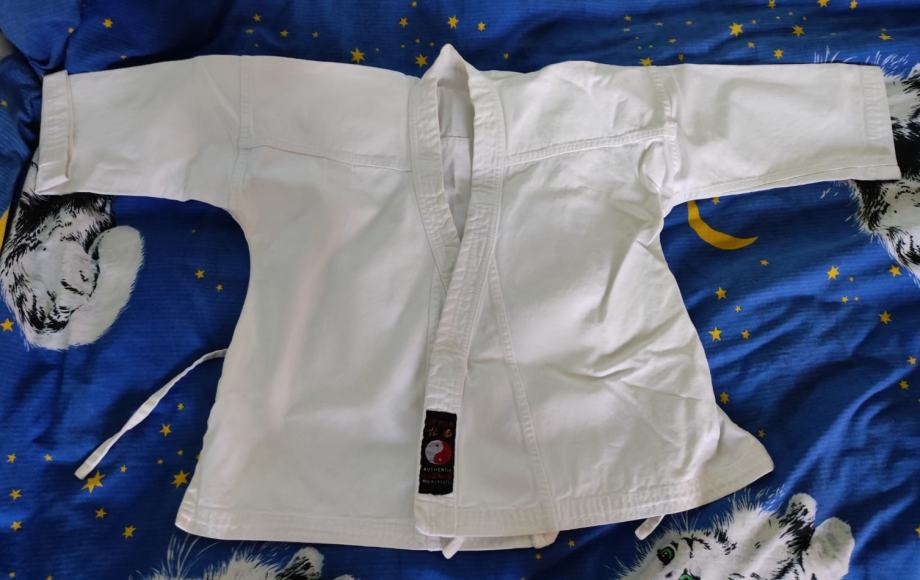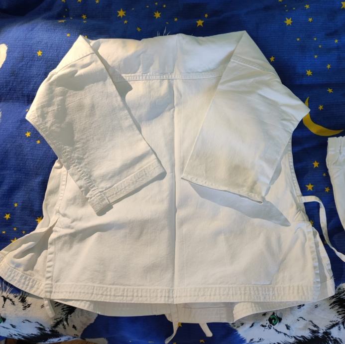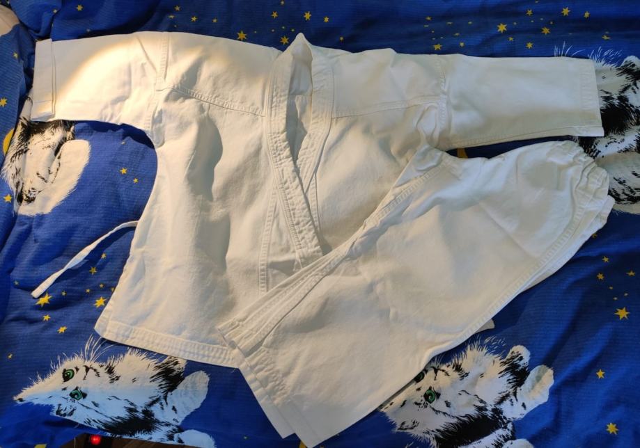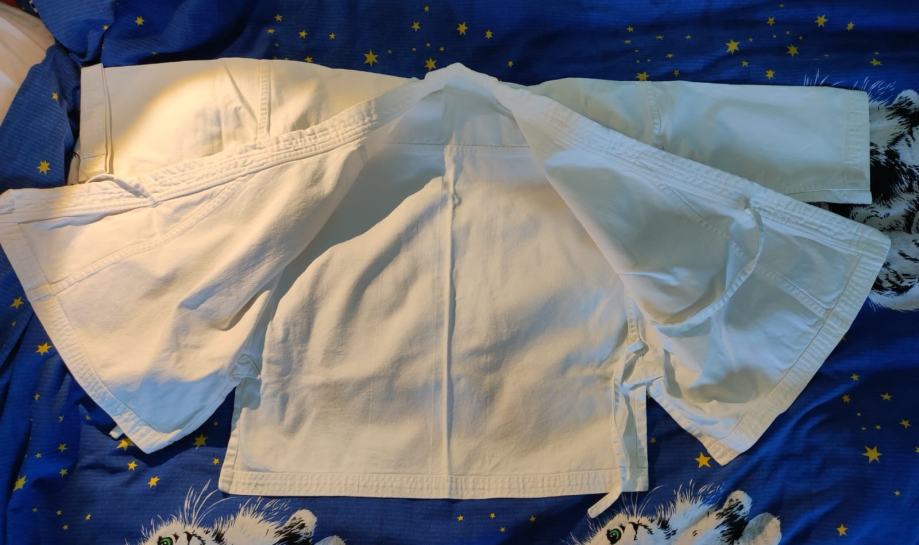 Karate kimono, solidno uščuvan, veličina cca 122, proizvođač je Šišmiš. Duljina gornjeg dijela je 57 cm, a hlače su duge 65 cm, što odgovara veličini za 6-7 godina. Veličina nije navedena na kimonu. Sve vezice su na broju.