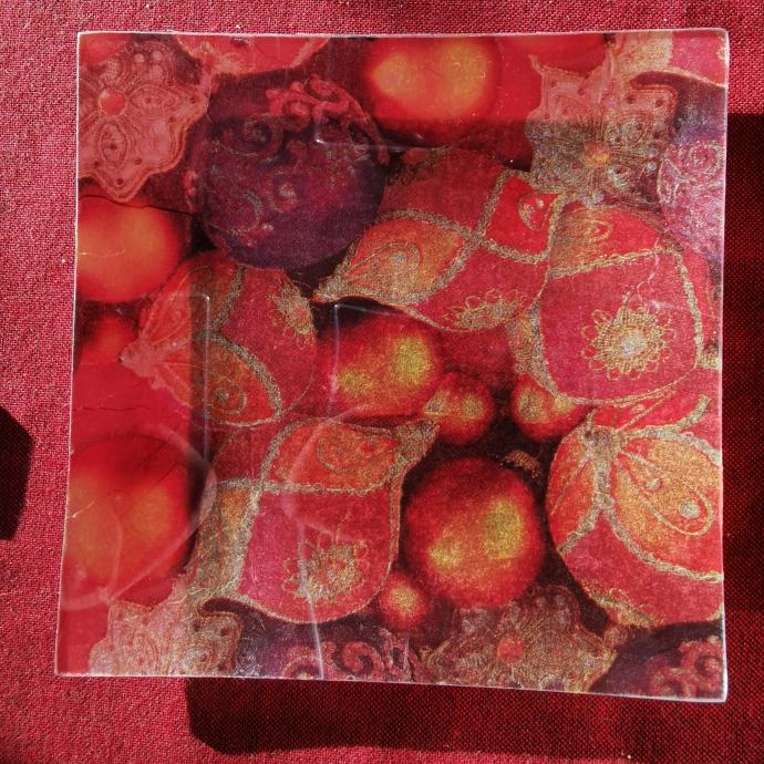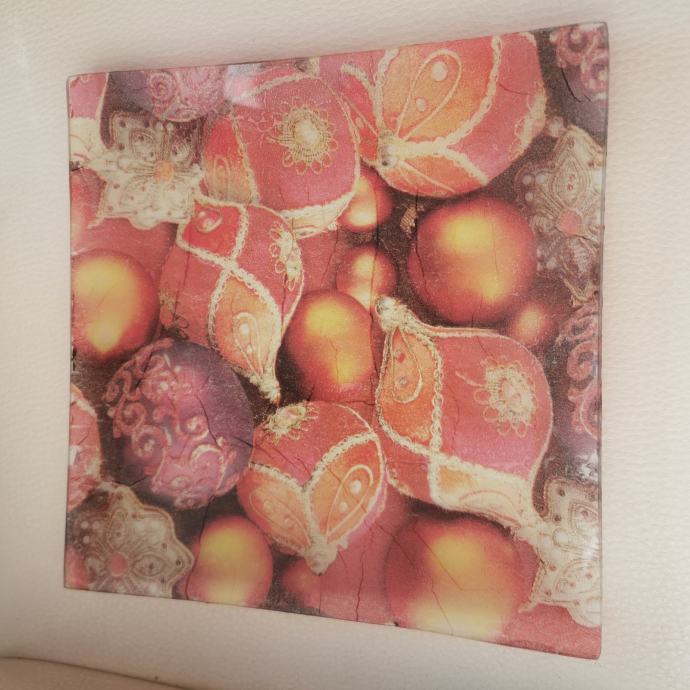 Tanjur je od stakla, kockasti, a krase ga crveni i zlatni božićni ukrasi.