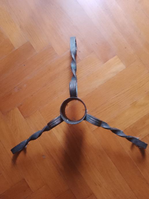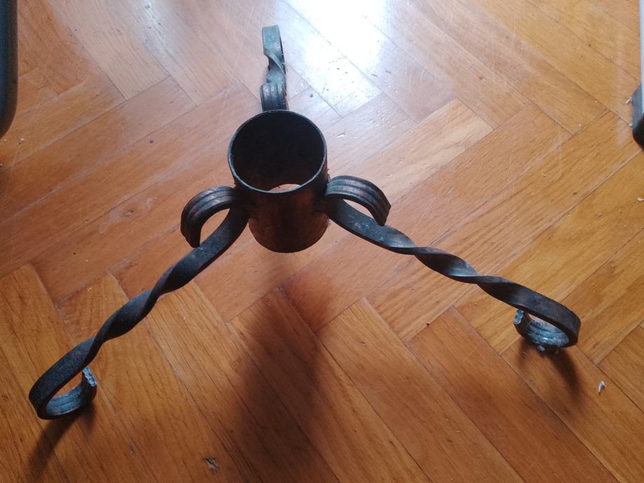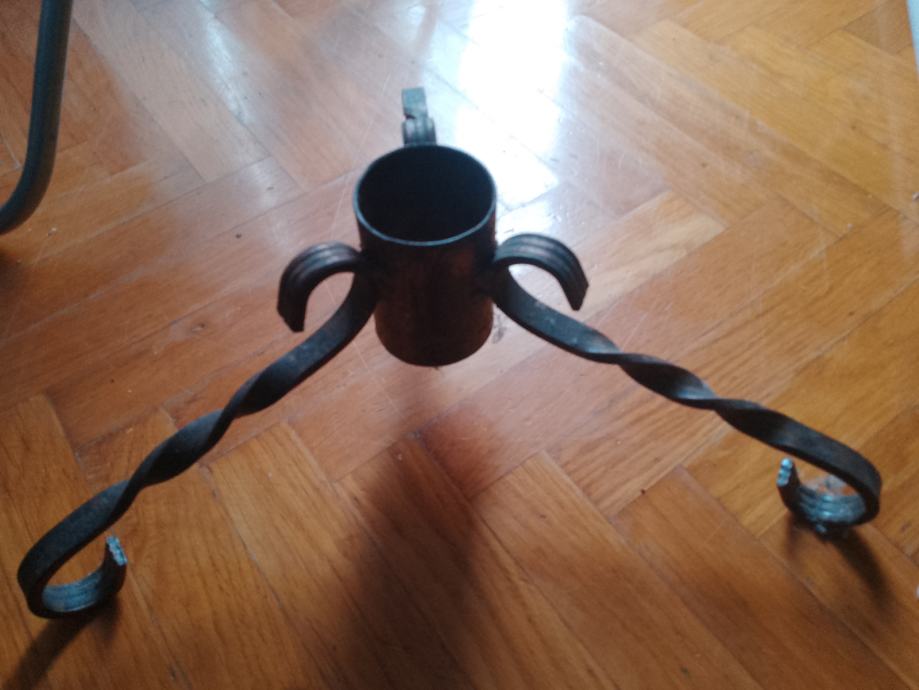Željezni stalak za bor / jelku ili neko drugo drvo / biljku . Korišten, očuvan. Taman za božićne blagdane. Nama više ne treba. Promjer 5.5 cm. Može stati i šire drvce ako se pri dnu malo stanji. 5 e. Ne šaljem radi težine.