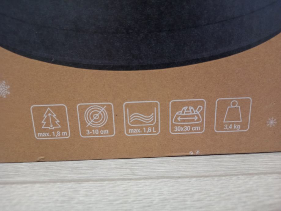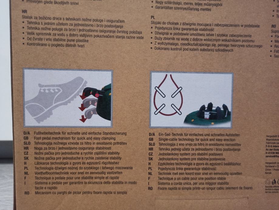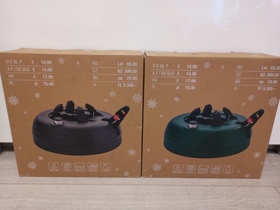 Opis: Čvrst i stabilan stalak za božićno drvce, sa spremnikom za vodu i indikatorom razine vode (indikator ne zahtijeva baterije za rad), s automatskim mehanizmom za zatvaranje stalka i nogarom.