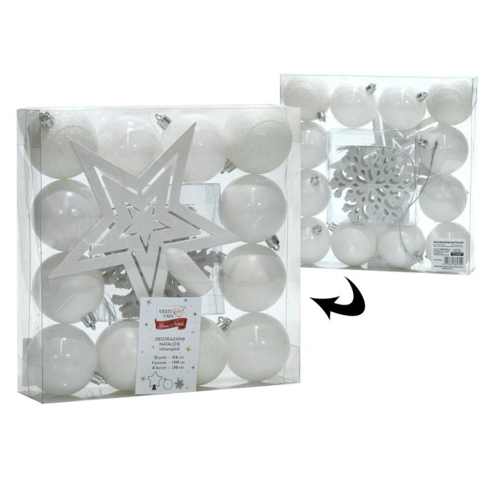 Set bijelih kuglica za bor, dimenzija 17/1 promjera 6 cm, sa zvijezdom visine 19 cm i pahuljama promjera 10 cm su elegantan ukras za božićno drvce.