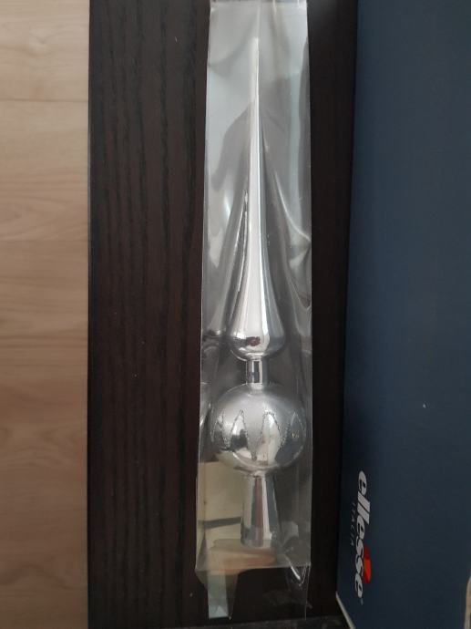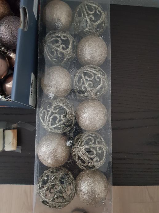 Božićne kuglice i vrh za bor srebrni, kuglice su boja starog zlata, smeđkaste nijanse, srebrne, više od 70 komada