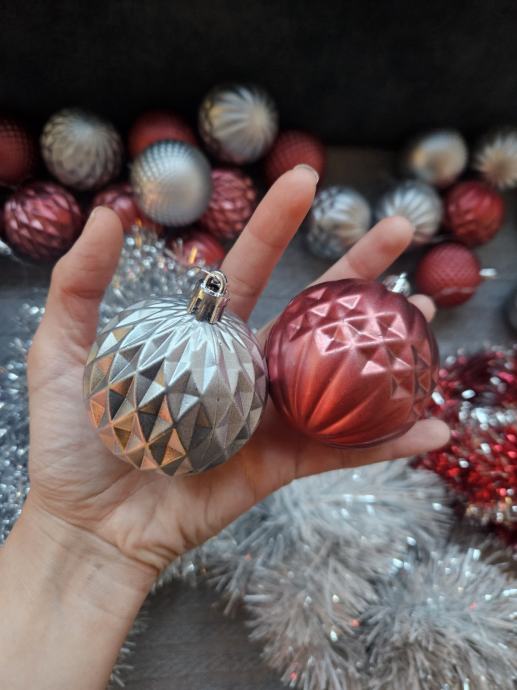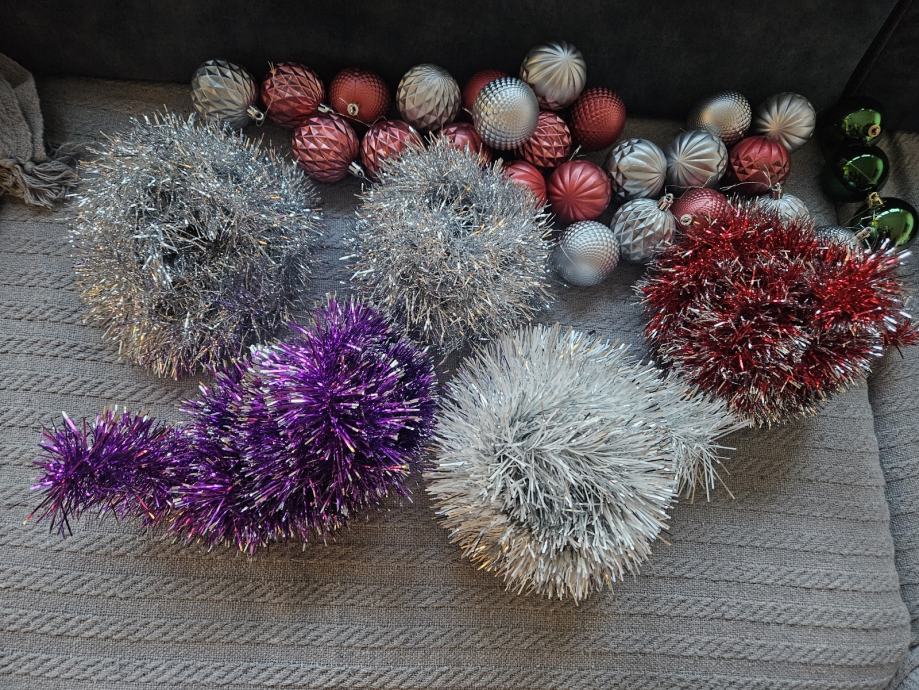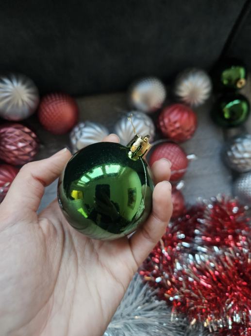 * 25kom (3 vrste) kuglica za bor : mat roze (12kom) i srebne (12kom) te sjane zelene (3kom) (veličina 5.5cm);