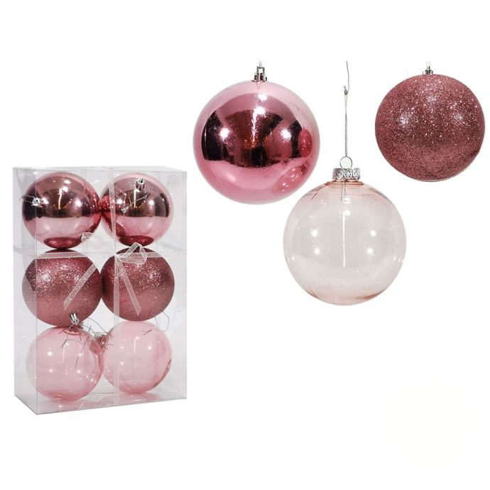 Kuglice za bor u boji roze, set od 6 komada, s dimenzijama 10 cm, pružaju raznolikost uz dodatak sjaja, mat površine i glitera.