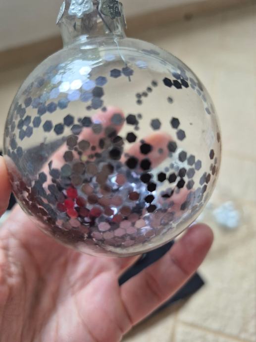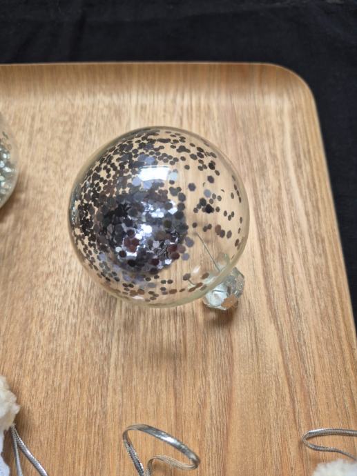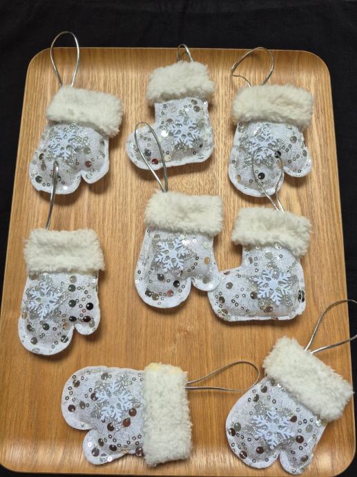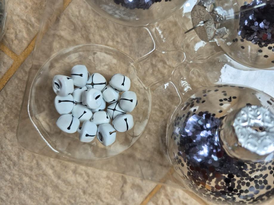 Sedam staklenih kuglica, osam mekanih ukrasa (šest rukavica, dvije čizmice), maleni metalni praporci (oko 1.5 cm, 17 kom)