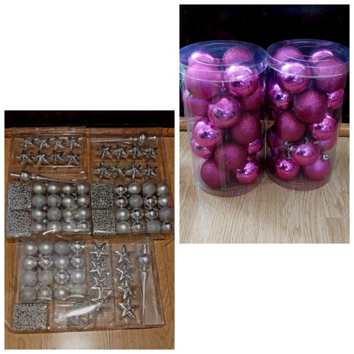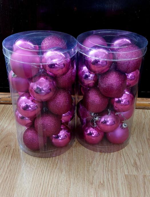 Promjeri kuglica su 5cm i njih je 48 kom u kompletu sa srebrnim ukrasnim lancem za bor, te sa vrhom, prodajem zajedno sa Tamno rozim kuglicama ( 40 kom) za 25€