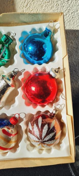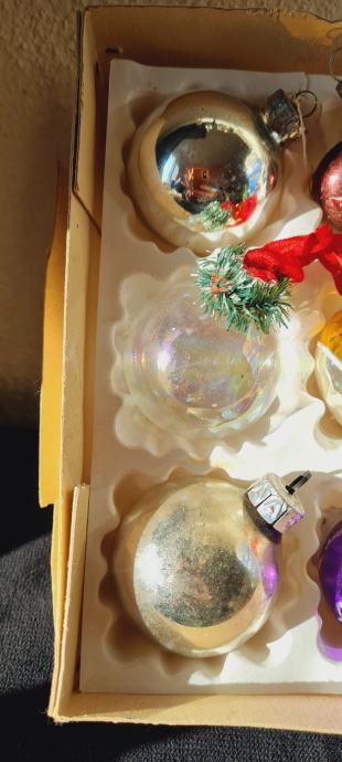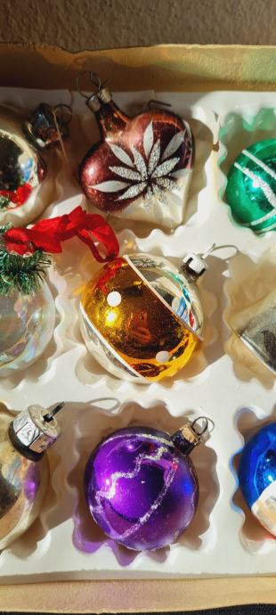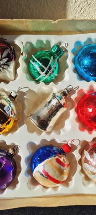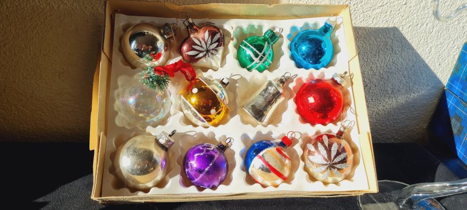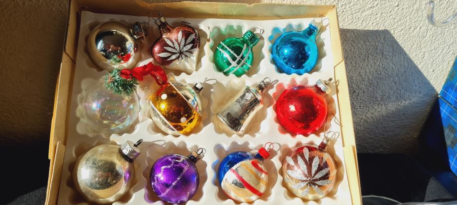 Kuglice za bor.... iz 60-ih godina prošlog stoljeća. Nisu ni skroz male, a ni velike. 12 komada. Oko 4 ili 5 cm